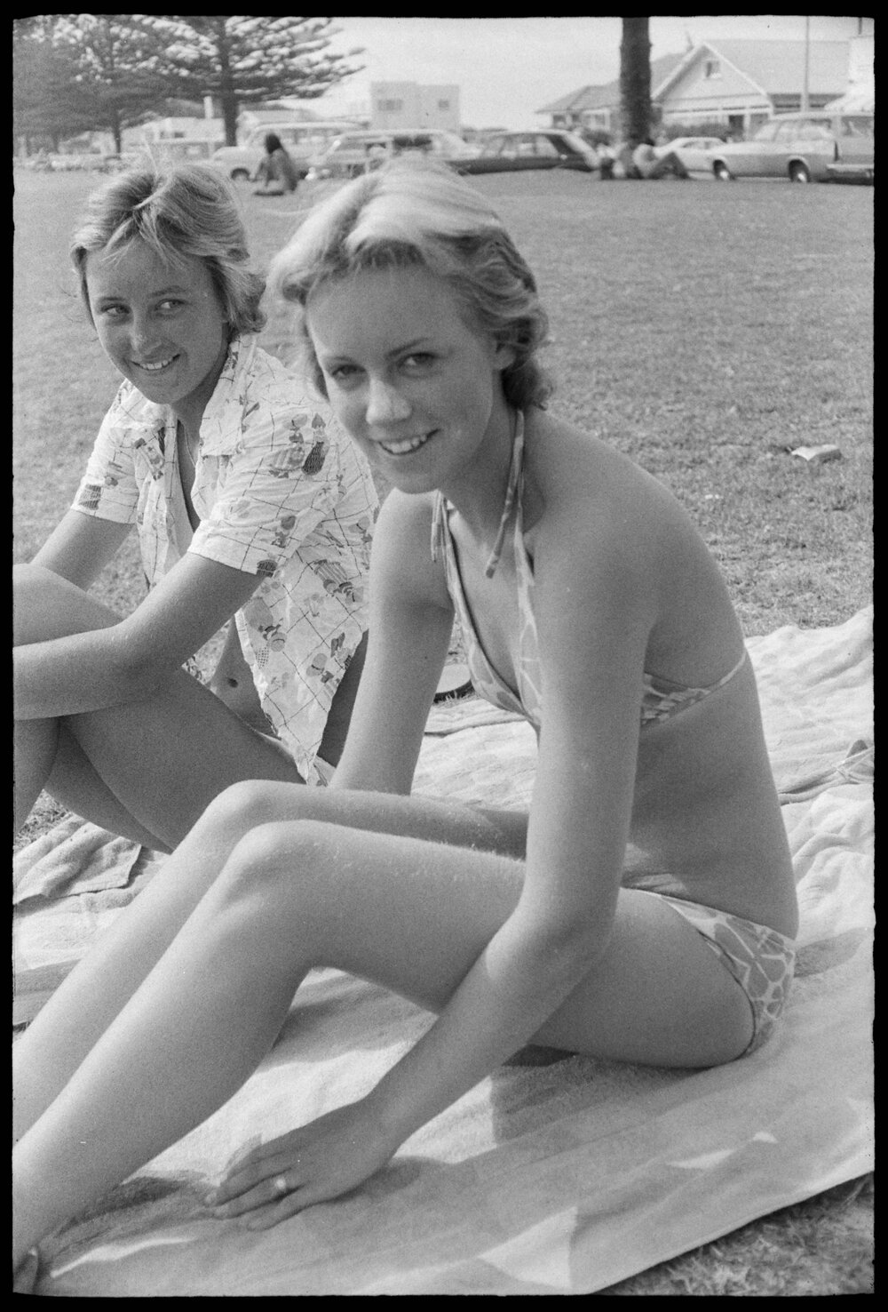 Date30 January 1975Reference Numberphoto gcc-32397DescriptionTwo New Plymouth visitors who hitch-hiked to Tauranga, from left, Helen Chapman and Carol Burgess, relax in the sun on Mount Maunganui's main beach. Published 30 January 1975.FormatNegativePhysical Description35mm black-and-white negative (2/3)Photographer/CreatorBay of Plenty Times