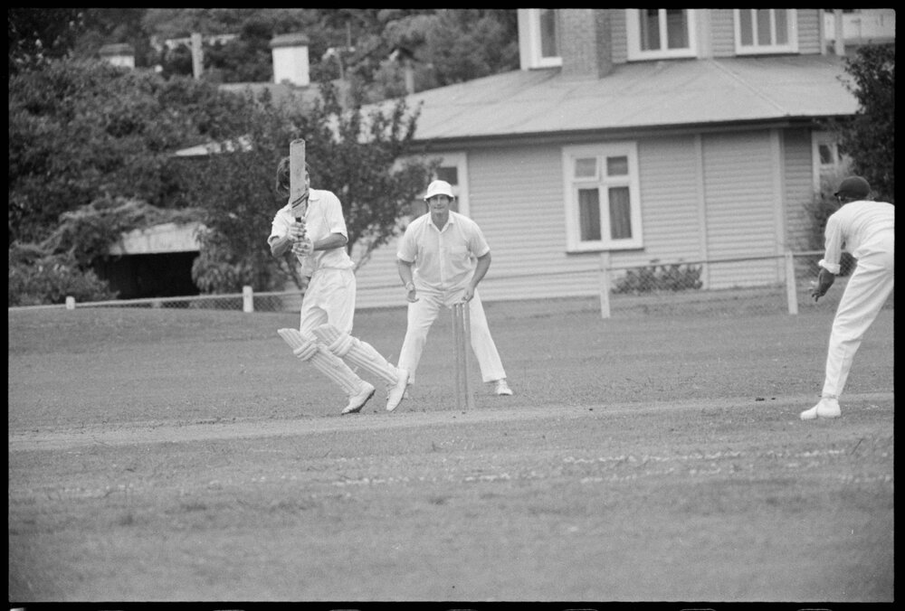 Date30 January 1975Reference Numberphoto gcc-32400DescriptionTony Taine hitting a ball through mid-wicket yesterday for Kings College (Auckland) during its cricket match against a Tauranga President's XI at the Tauranga Domain. Others in the picture are Stewart Browne (middle) and Errol Travers. Published 30 January 1975.FormatNegativePhysical Description35mm black-and-white negative (2/8)Photographer/CreatorBay of Plenty Times