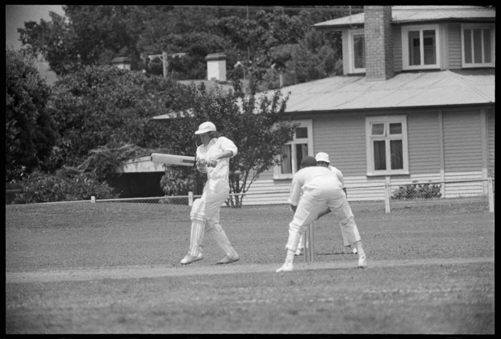 Date30 January 1975Reference Numberphoto gcc-32403DescriptionTony Taine hitting a ball through mid-wicket yesterday for Kings College (Auckland) during its cricket match against a Tauranga President's XI at the Tauranga Domain. Others in the picture are Stewart Browne (middle) and Errol Travers. Published 30 January 1975.FormatNegativePhysical Description35mm black-and-white negative (5/8)Photographer/CreatorBay of Plenty Times