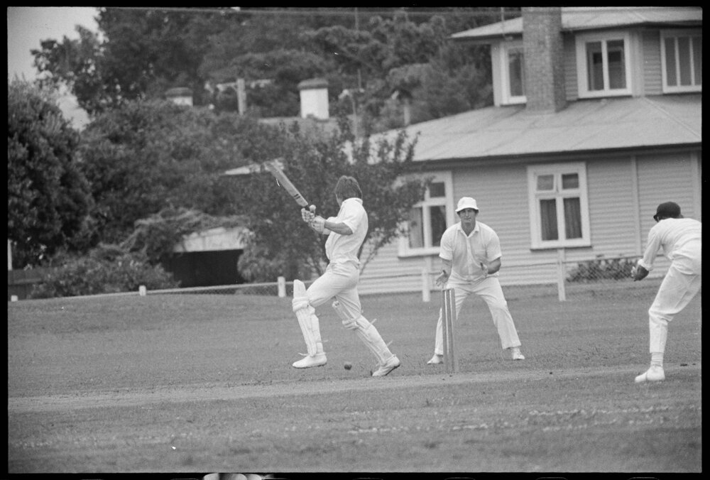 Date30 January 1975Reference Numberphoto gcc-32406DescriptionTony Taine hitting a ball through mid-wicket yesterday for Kings College (Auckland) during its cricket match against a Tauranga President's XI at the Tauranga Domain. Others in the picture are Stewart Browne (middle) and Errol Travers. Published 30 January 1975.FormatNegativePhysical Description35mm black-and-white negative (8/8)Photographer/CreatorBay of Plenty Times