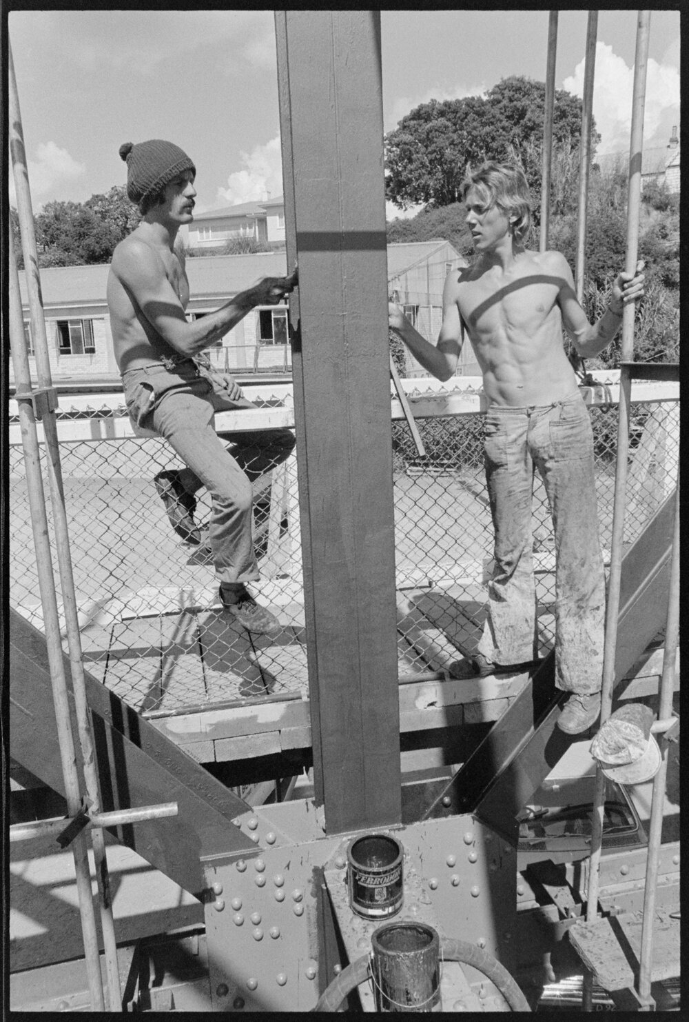 Date31 January 1975Reference Numberphoto gcc-32410DescriptionGiving the bridge a face-lift are Mr Bruce Little (left) and Ross Schabe, both of Australia. Two of the 14 spans of the Matapihi Railway Bridge have been painted in the past 4 months. It is expected to take at least 18 months to complete the whole bridge. Published 31 January 1975.FormatNegativePhysical Description35mm black-and-white negative (4/8)Photographer/CreatorBay of Plenty Times