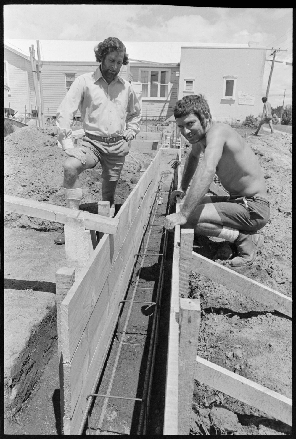 Date1 February 1975Reference Numberphoto gcc-32427DescriptionReverend David Pratt, with a worker, on the building site of the new St. James Union Church, resulting from the merger of the Greerton Methodist and Presbyterian congregations. Published 1 February 1975.FormatNegativePhysical Description35mm black-and-white negative (1/7)Photographer/CreatorBay of Plenty Times