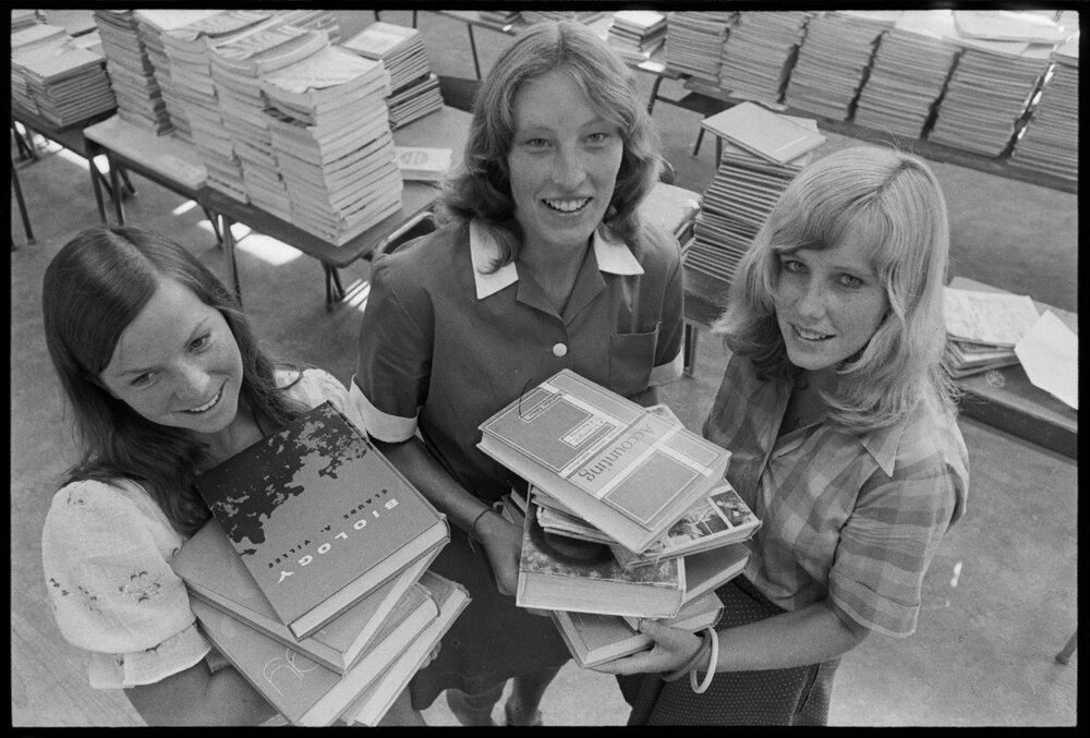Date3 February 1975Reference Numberphoto gcc-32460DescriptionTauranga Girls College seventh formers, from left, Carol Keenan, Kay Luxmoore, and Christine White, shown studying some of the text books they will be using. Published 3 February 1975.FormatNegativePhysical Description35mm black-and-white negative (1/8)Photographer/CreatorBay of Plenty Times