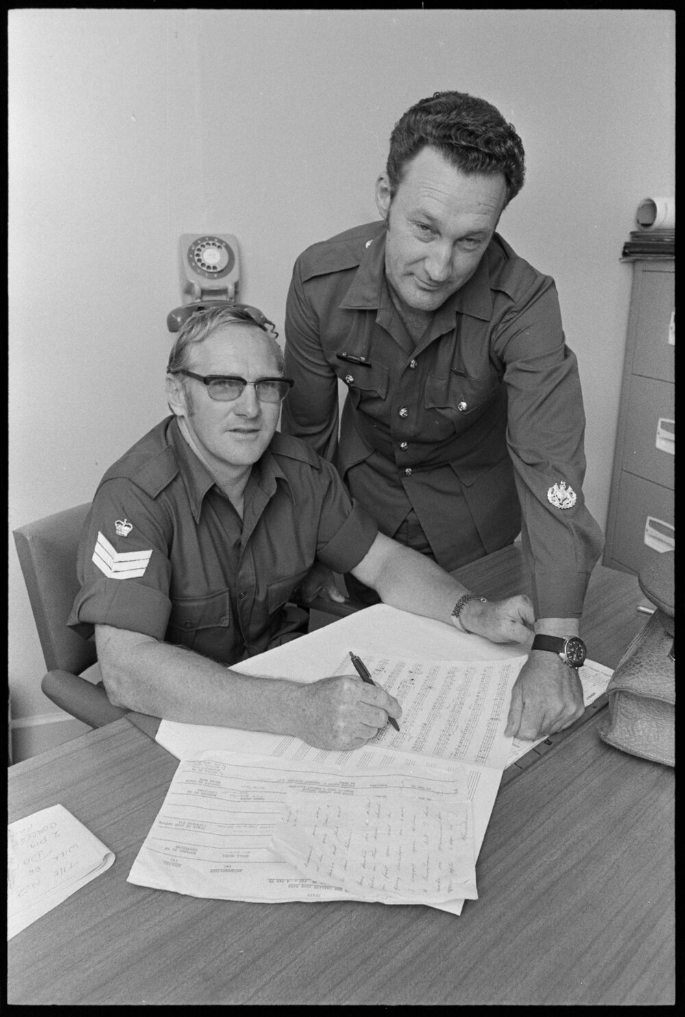 Date4 February 1975Reference Numberphoto gcc-32492DescriptionThe New Zealand Army Brass Band which won acclaim at the New Zealand Commonwealth Games last year in Christchurch will play in Tauranga next month. Discussing arrangements for the visit of the Army Band of New Zealand is Staff Sergeant Allan Martin recruiting NCO, of Tauranga (left) and band leader Warrant Officer Les Mooney, of Christchurch. Published 4 February 1975.FormatNegativePhysical Description35mm black-and-white negative (4/6)Photographer/CreatorBay of Plenty Times