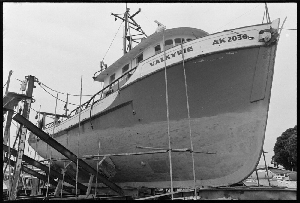 Date5 February 1975Reference Numberphoto gcc-32498DescriptionThe large Sanfords Fisheries Ltd boat, Valkyrie, dwarfs its surroundings on the Bay of Plenty Harbour Board's slipway at Sulphur Point where it is having its thrice-yearly scrub and paint. Published 5 February 1975.FormatNegativePhysical Description35mm black-and-white negative (1/3)Photographer/CreatorBay of Plenty Times