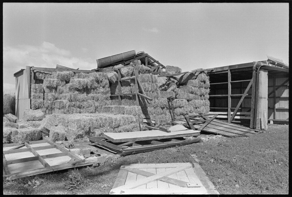 Date8 February 1975Reference Numberphoto gcc-32589DescriptionA 3000-bale capacity haybarn owned by Mr. H. S. Hopkins, of Kauri Point, which lost one wall and its roof during yesterday's gale .Published 8 February 1975.FormatNegativePhysical Description35mm black-and-white negative (2/3)Photographer/CreatorBay of Plenty Times