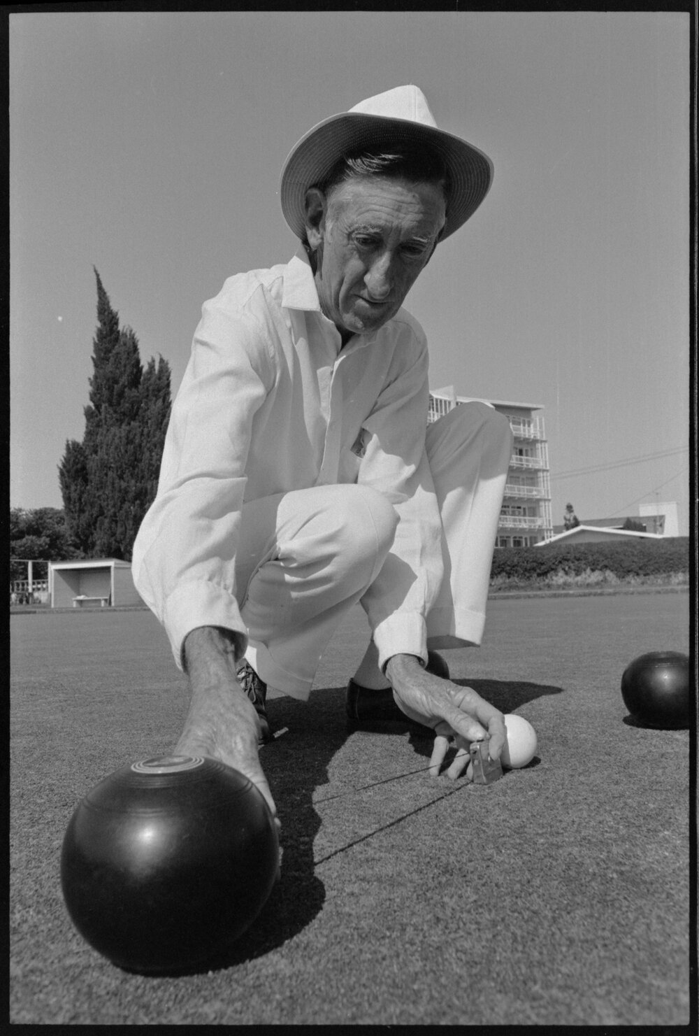 Date11 February 1975Reference Numberphoto gcc-32656DescriptionOne of New Zealand's biggest bowling tournaments, staged by Tauranga combined bowling clubs, entered its second today today. Here W. Roberts, the number three from a Huntly team, measures the balls at the Cliff Road greens. Published 11 February 1975.FormatNegativePhysical Description35mm black-and-white negative (1/3)Photographer/CreatorBay of Plenty Times