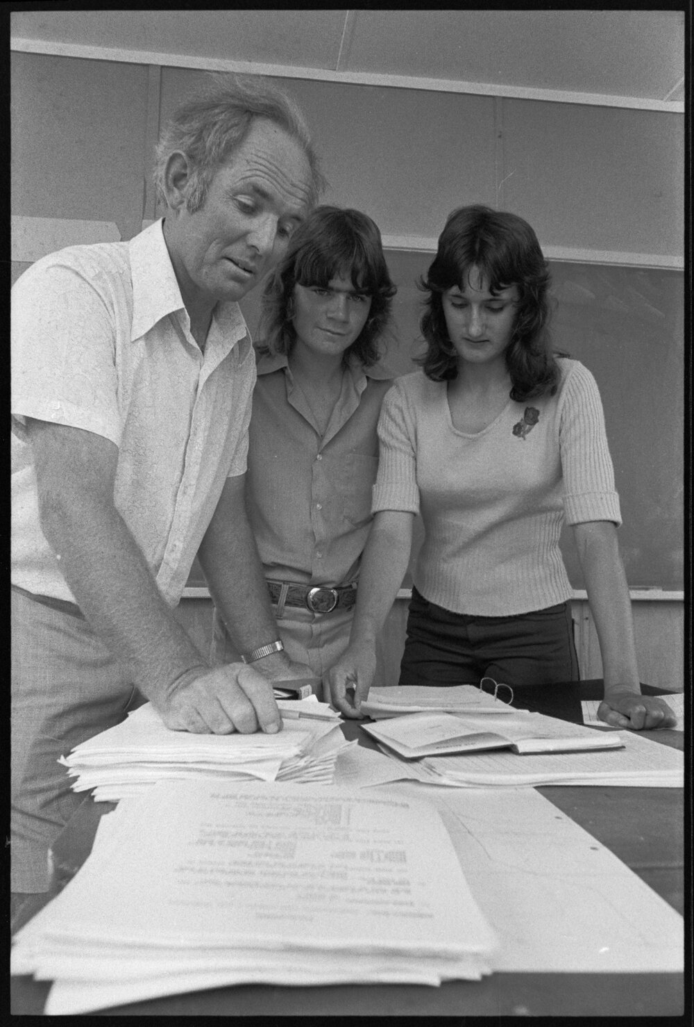 Date12 February 1975Reference Numberphoto gcc-32659DescriptionWaikato Technical Institute lecturer Mr Ray Corby with two of the students who joined the farm cadet training course in Tauranga today. The students