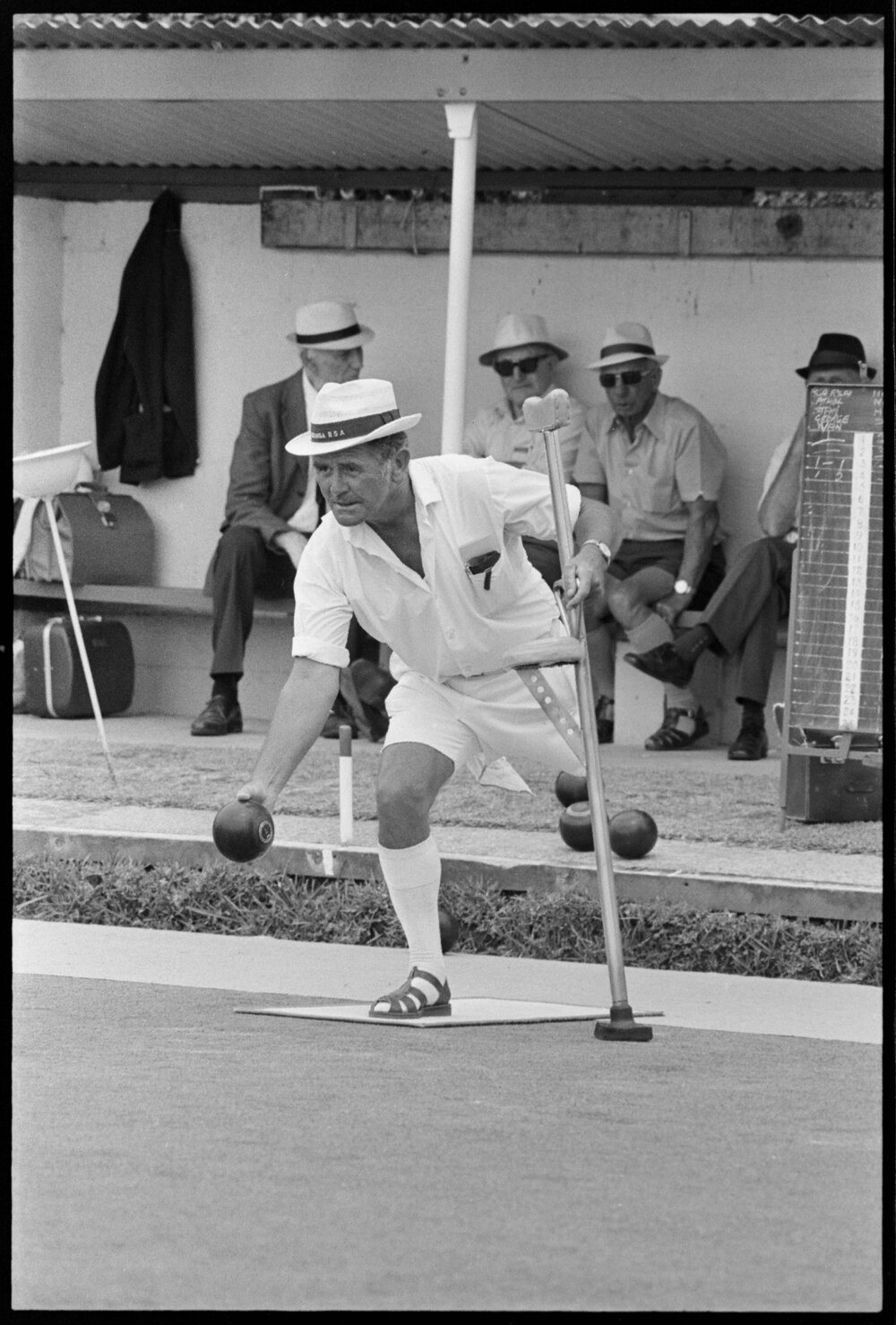 Date13 February 1975Reference Numberphoto gcc-32662DescriptionSupported by his walking stick, the one-legged Stan Mortlock, of the Tauranga RSA club, delivers a bowl at the Tauranga combined