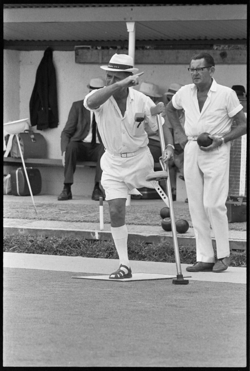 Date13 February 1975Reference Numberphoto gcc-32664DescriptionSupported by his walking stick, the one-legged Stan Mortlock, of the Tauranga RSA club, delivers a bowl at the Tauranga combined