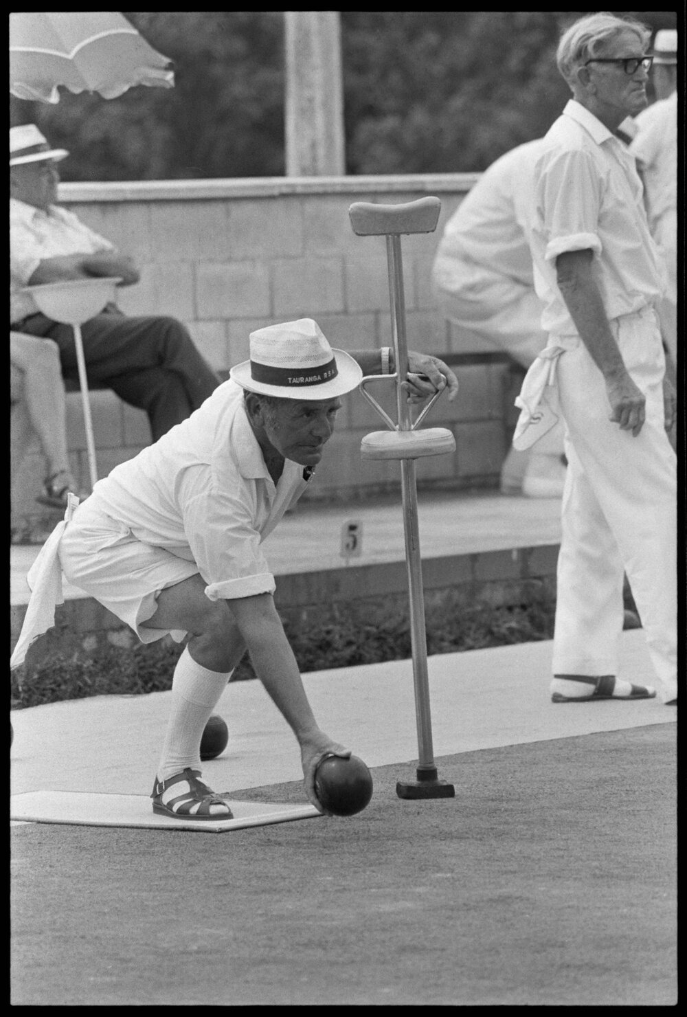 Date13 February 1975Reference Numberphoto gcc-32665DescriptionSupported by his walking stick, the one-legged Stan Mortlock, of the Tauranga RSA club, delivers a bowl at the Tauranga combined