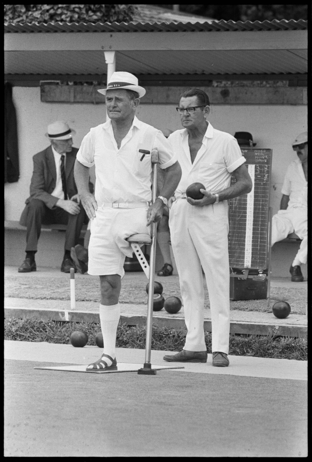 Date13 February 1975Reference Numberphoto gcc-32667DescriptionSupported by his walking stick, the one-legged Stan Mortlock, of the Tauranga RSA club, delivers a bowl at the Tauranga combined