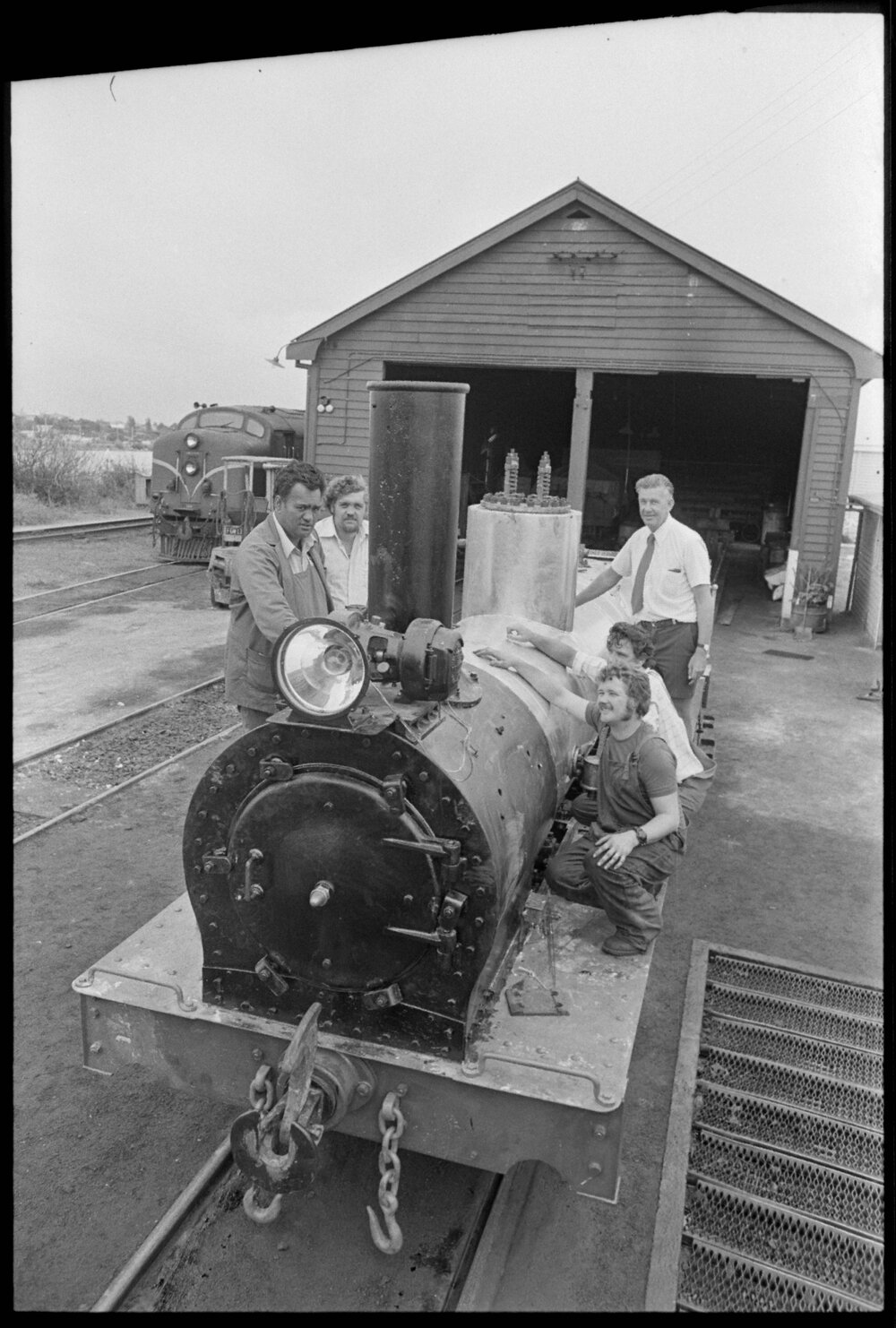 Date13 February 1975Reference Numberphoto gcc-32668DescriptionMessrs Peter Jones, who is in charge of restoration, and Brian Kidd, of the Ministry of Transport's marine division, study insulation of the Tauranga District Museum's steam locomotive which is expected to be fired up for the first time in late April. Published 13 February 1975.FormatNegativePhysical Description35mm black-and-white negative (1/3)Photographer/CreatorBay of Plenty Times