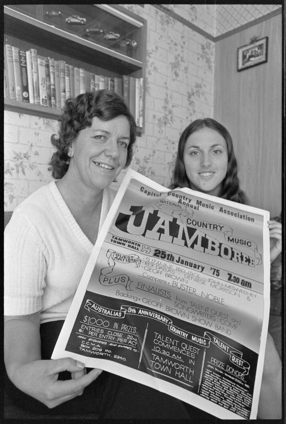 Date14 February 1975Reference Numberphoto gcc-32682DescriptionMarian White (left) and Pat Seales back from competing at the National Country Music Jamboree in Australia. Published 14 February 1975.FormatNegativePhysical Description35mm black-and-white negative (5/7)Photographer/CreatorBay of Plenty Times