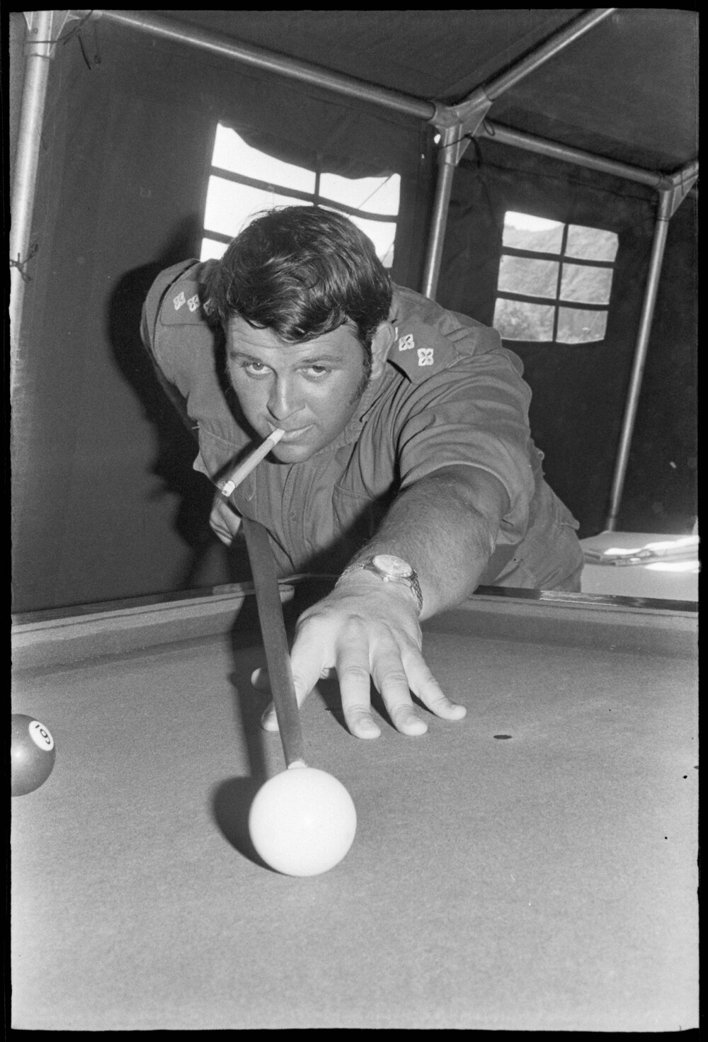 Date15 February 1975Reference Numberphoto gcc-32703DescriptionPlaying pool on a table resting in the Taraweras is the officer commanding "C" Company, Captain N. B. Johnstone. Both the officers and the Territorial volunteers have a pool table and a bar in their mess. One of the 250 territorial volunteers of the 6th Battalion (Hauraki) RNZIR, who are staying in the Tarawera Ranges. Published 15 February 1975.FormatNegativePhysical Description35mm black-and-white negative (1/3)Photographer/CreatorBay of Plenty Times