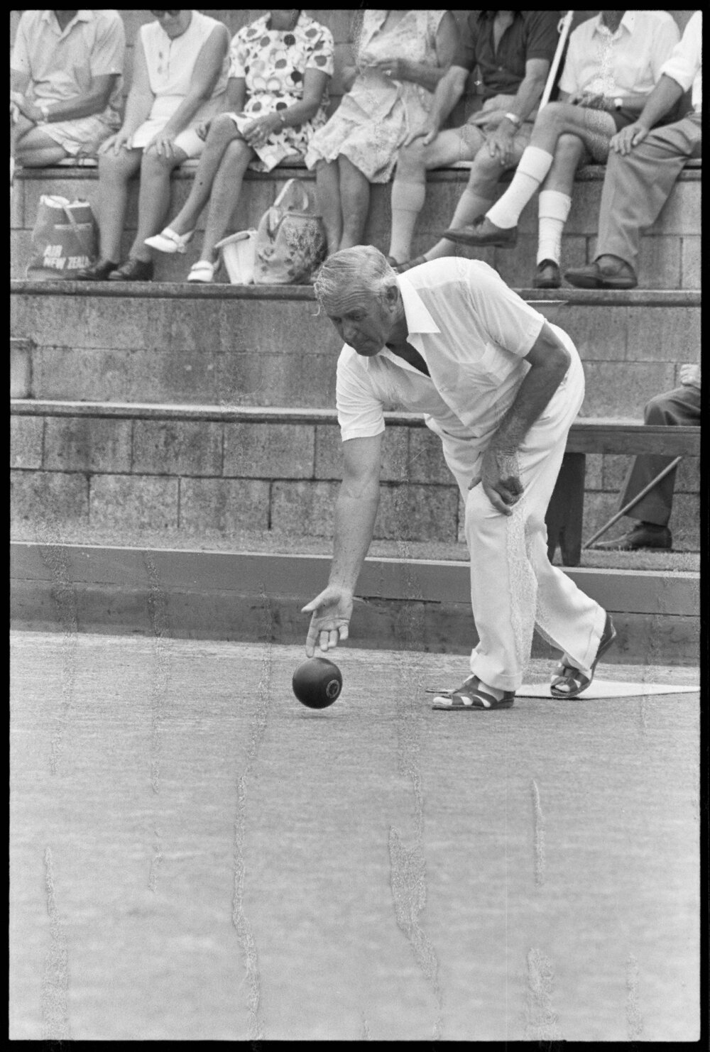 Date17 February 1975Reference Numberphoto gcc-32757DescriptionPlayer at theTauranga combined bowling clubs' open fours tournament. Published 17 February 1975.FormatNegativePhysical Description35mm black-and-white negative (12/12)Photographer/CreatorBay of Plenty Times