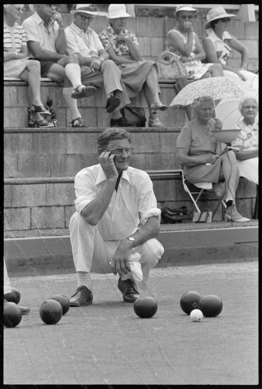 Date17 February 1975Reference Numberphoto gcc-32780DescriptionCliff Potter (Pukekohe) during his semi-final win in the Tauranga combined bowling Clubs' open fours tournament at the Tauranga RSA club. Published 17 February 1975.FormatNegativePhysical Description35mm black-and-white negative (17/18)Photographer/CreatorBay of Plenty Times