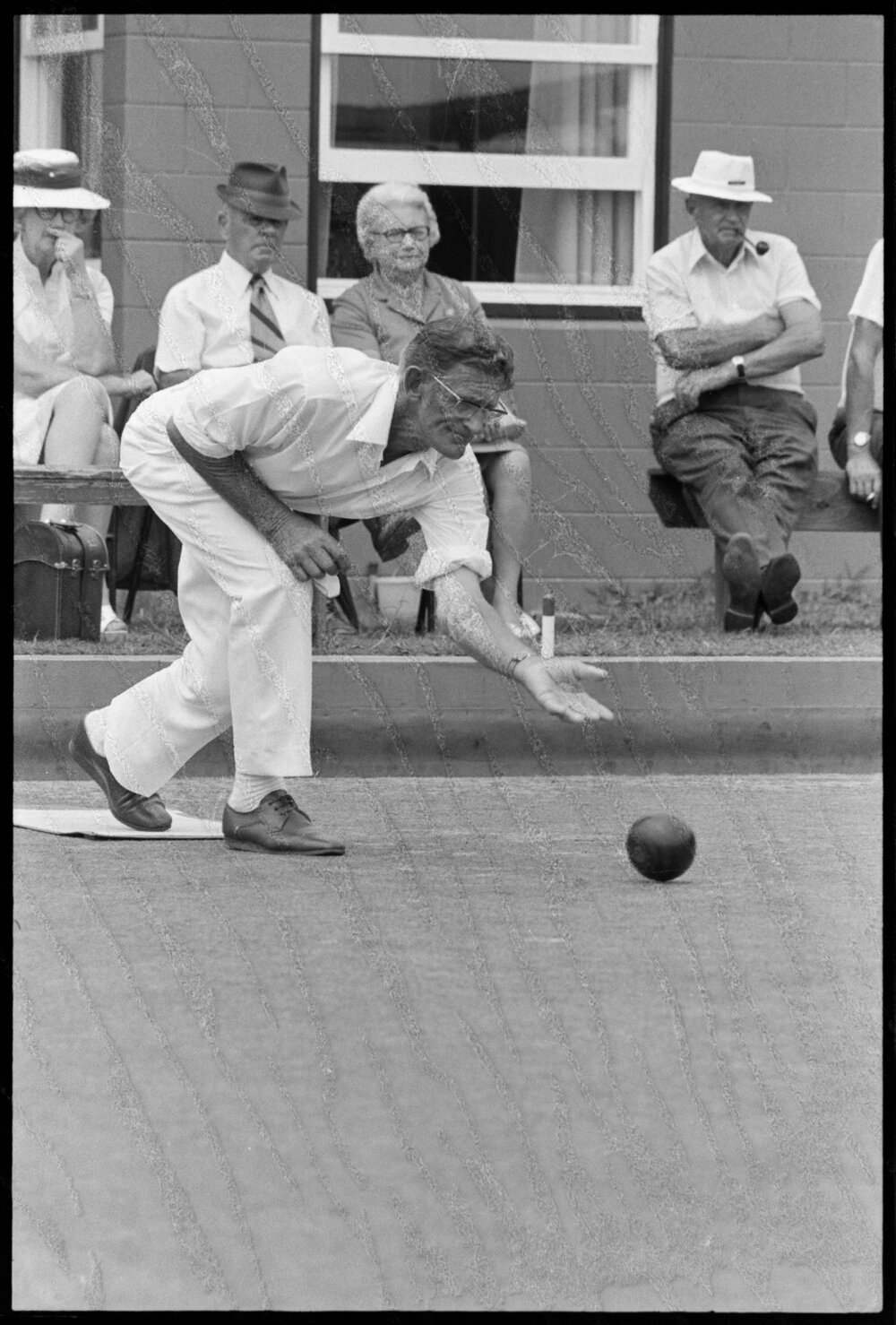 Date17 February 1975Reference Numberphoto gcc-32781DescriptionCliff Potter (Pukekohe) during his semi-final win in the Tauranga combined bowling Clubs' open fours tournament at the Tauranga RSA club. Published 17 February 1975.FormatNegativePhysical Description35mm black-and-white negative (18/18)Photographer/CreatorBay of Plenty Times