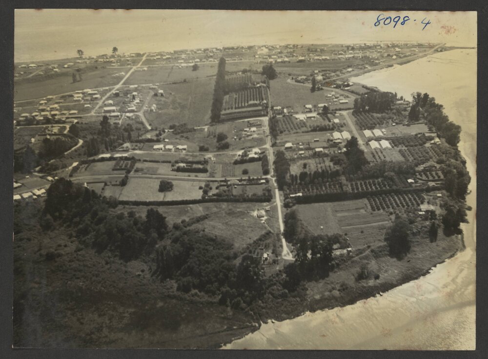 Date1956Reference NumberPhoto 25-1880DescriptionAerial photograph affixed to page 3 of the 'album with views of Matua and Mount Maunganui', 1956 (Ams 344/1).FormatPrint