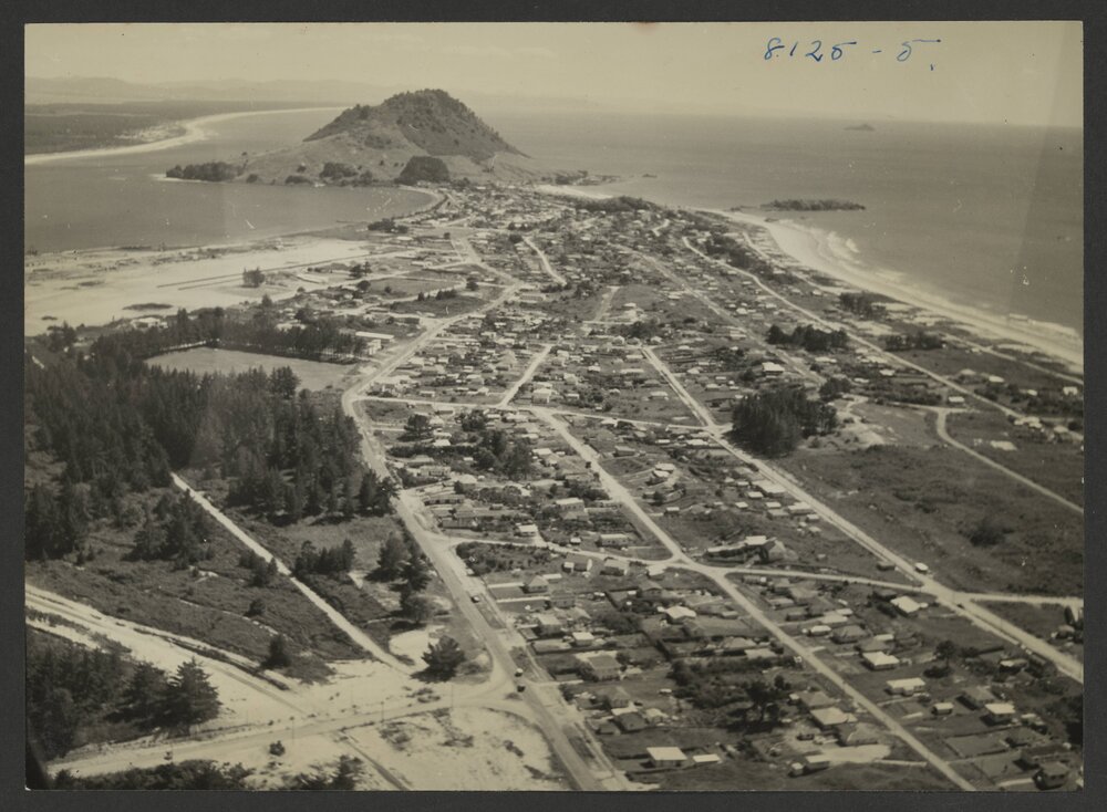 Date1956Reference NumberPhoto 25-1909DescriptionAerial photograph from page 33 of the photograph 'album with views of Matua and Mount Maunganui' near the property of Naera Gail Imrie-Petherick, ( -2013), née NaumannFormatPrint