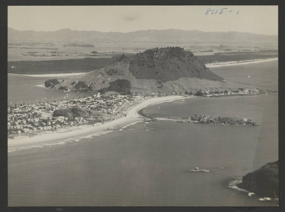 Date1956Reference NumberPhoto 25-1911DescriptionAerial photograph from page 35 of the photograph 'album with views of Matua and Mount Maunganui' near the property of Naera Gail Imrie-Petherick, ( -2013), née NaumannFormatPrint