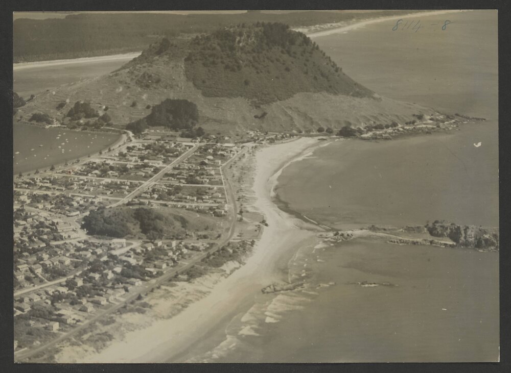 Date1956Reference NumberPhoto 25-1917DescriptionAerial photograph from page 41 of the photograph 'album with views of Matua and Mount Maunganui' near the property of Naera Gail Imrie-Petherick, ( -2013), née NaumannFormatPrint