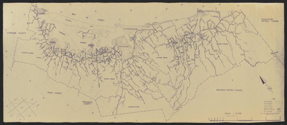 Reference NumberMap 24-288DescriptionCopy of boundary map of Western Bay of Plenty and adjoining a counties featuring railways, gas lines and roads.Map TypeLocal GovernmentPhysical DescriptionRolled black and white map size is 83cm x 198cmScale1:50,000