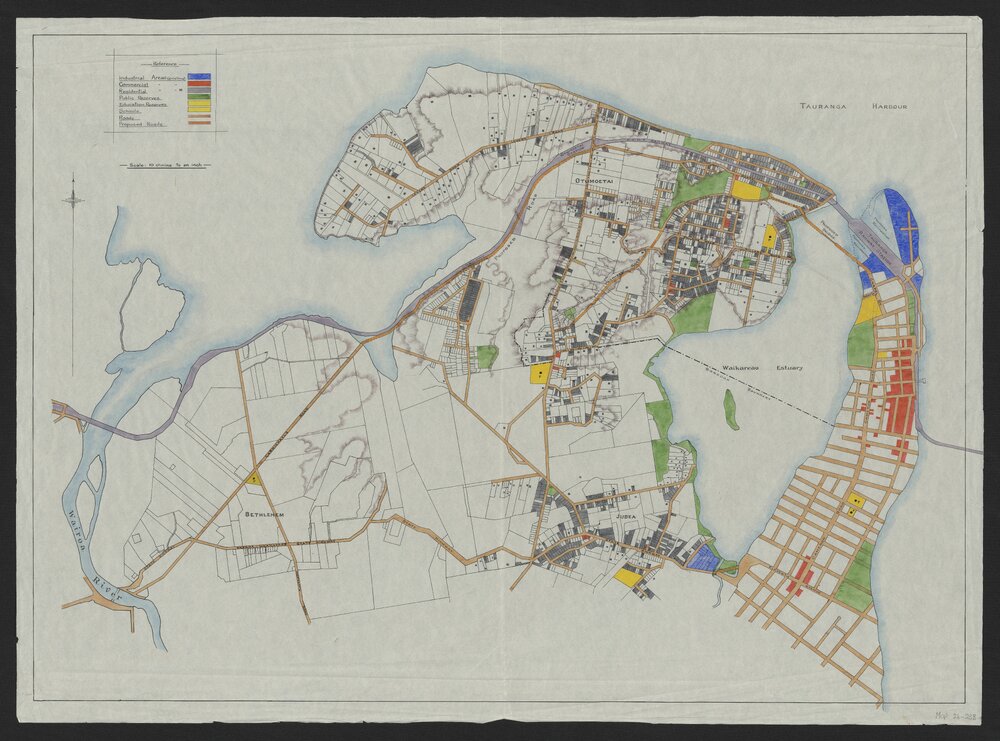 Datec. 1950sReference NumberMap 24-238DescriptionManuscript map of Tauranga and Ōtūmoetai showing streets (including proposed roads) and Ōtūmoetai properties; colour coded to show industrial, commercial and residential areas, public areas and schools. Shows the 1949 Borough boundaries and the Chapel Street Bridge as "proposed" (built 1959).Barcode33001000191055Map TypeLocal GovernmentPhysical DescriptionColour map size is 74cm x 101cmScale1:7,920