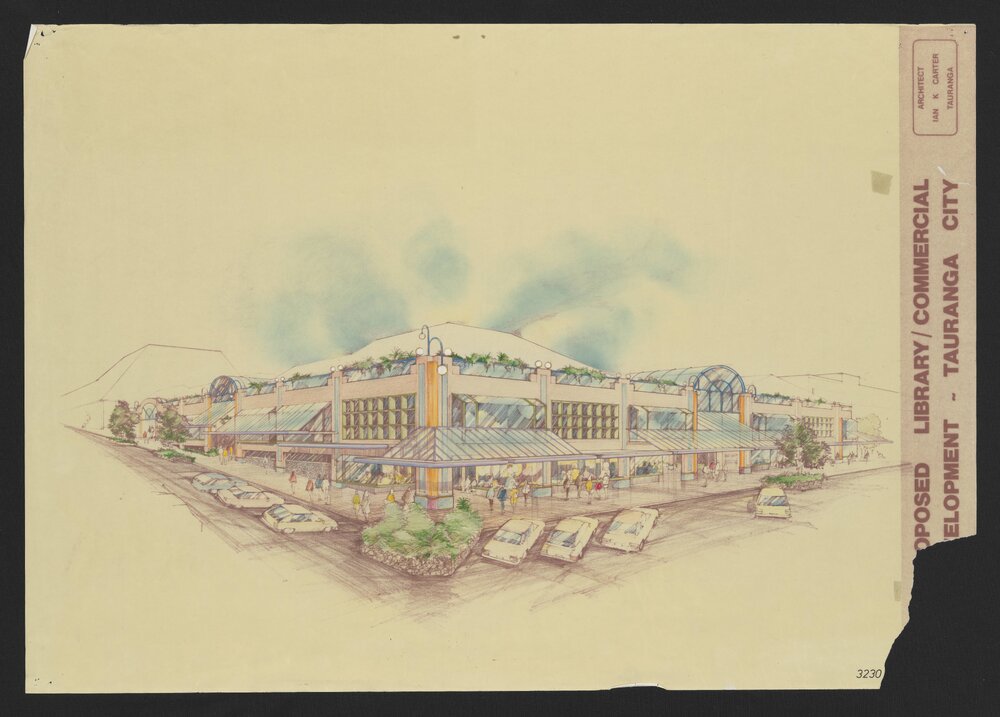 Tauranga City Council, Proposed Library illustration in colour - External View (March 1986). Pae Korokī, accessed 08/04/2026, https://paekoroki.tauranga.govt.nz/nodes/view/115597