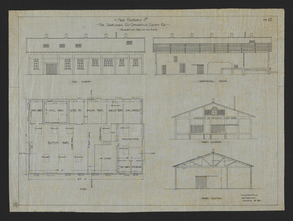 Clemson, H. H., Plan of The Tauranga Co-Operative Dairy Co. (1921). Pae Korokī, accessed 19/03/2026, https://paekoroki.tauranga.govt.nz/nodes/view/115794