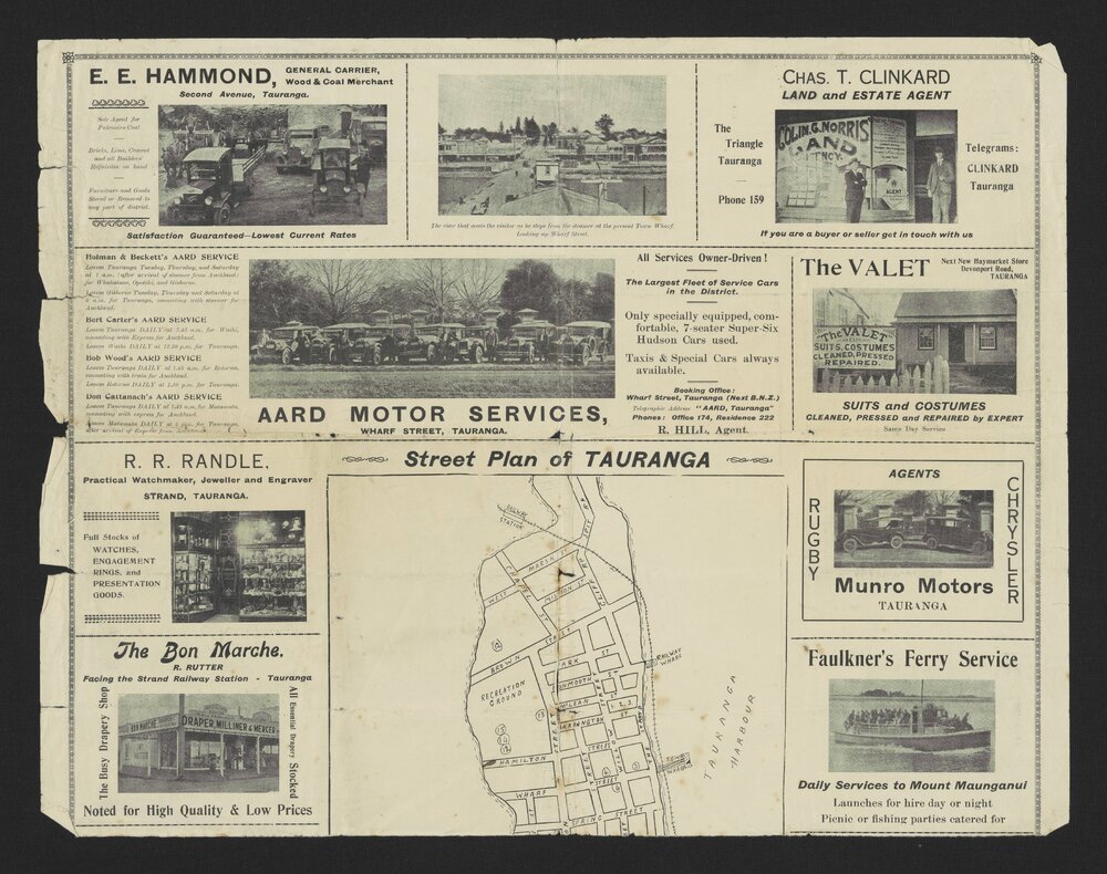 Pictorial Map Company, Advertising and street plan of Tauranga (c. 1920s to 1950s). Pae Korokī, accessed 19/03/2026, https://paekoroki.tauranga.govt.nz/nodes/view/115807