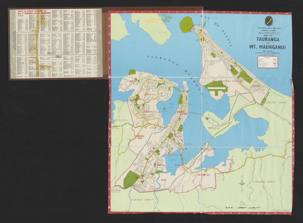 New Zealand Map and Guide Company, Tauranga city and Mt. Maunganui, including Ōtūmoetai and Greerton (c. 1965). Pae Korokī, accessed 09/04/2026, https://paekoroki.tauranga.govt.nz/nodes/view/115822