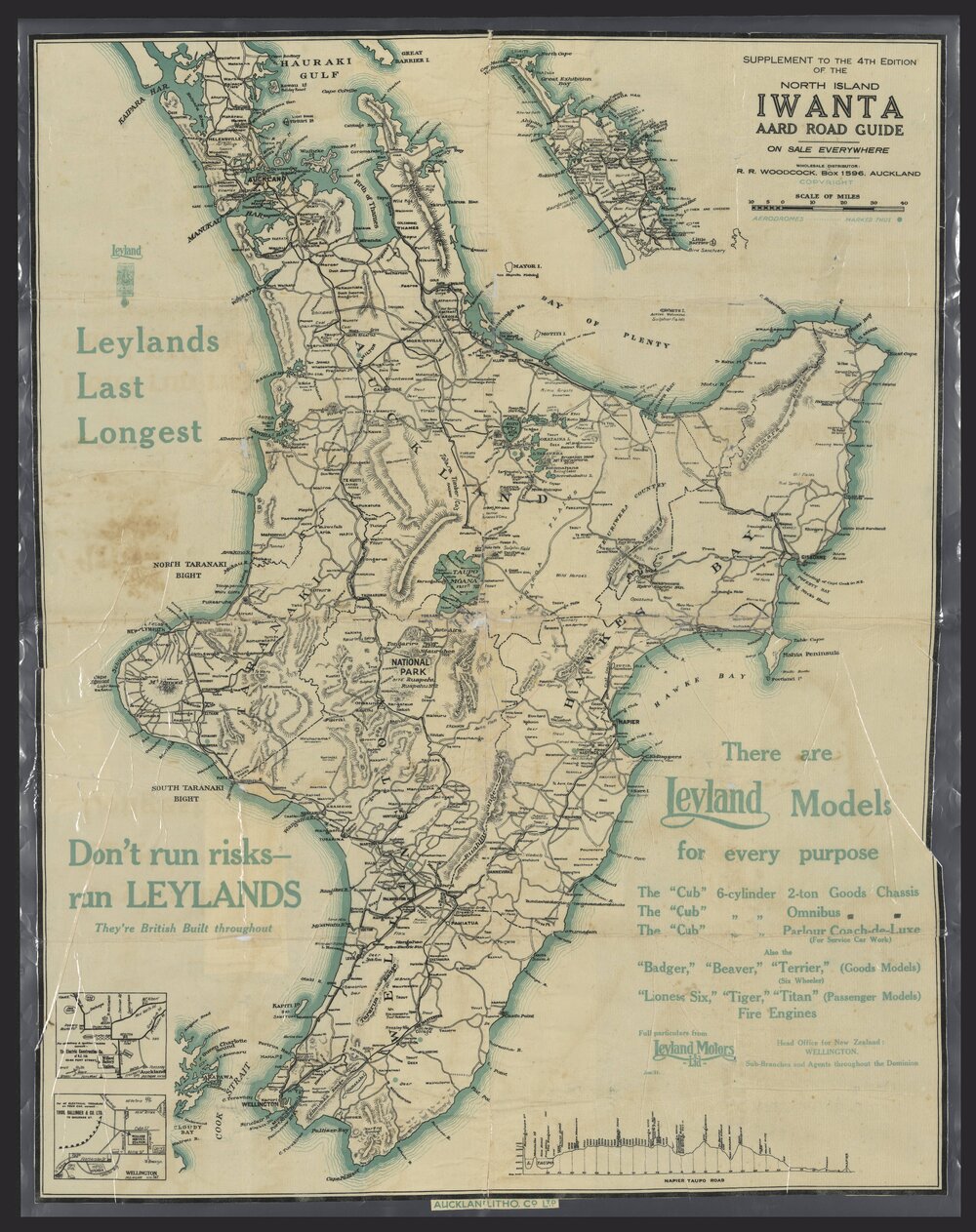 Leyland Motors Ltd, North Island Iwanta Aard Road Guide (1931). Pae Korokī, accessed 19/03/2026, https://paekoroki.tauranga.govt.nz/nodes/view/115834