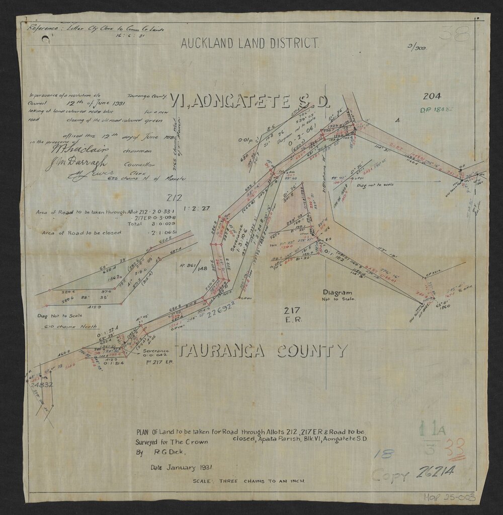 DateJanuary 1931Reference NumberMap 25-003DescriptionPlan of land to be taken for road through Allots 212, 217 E.R. & Road to be closed, Apata Parish, Blk. VI, Aongatete S.D.