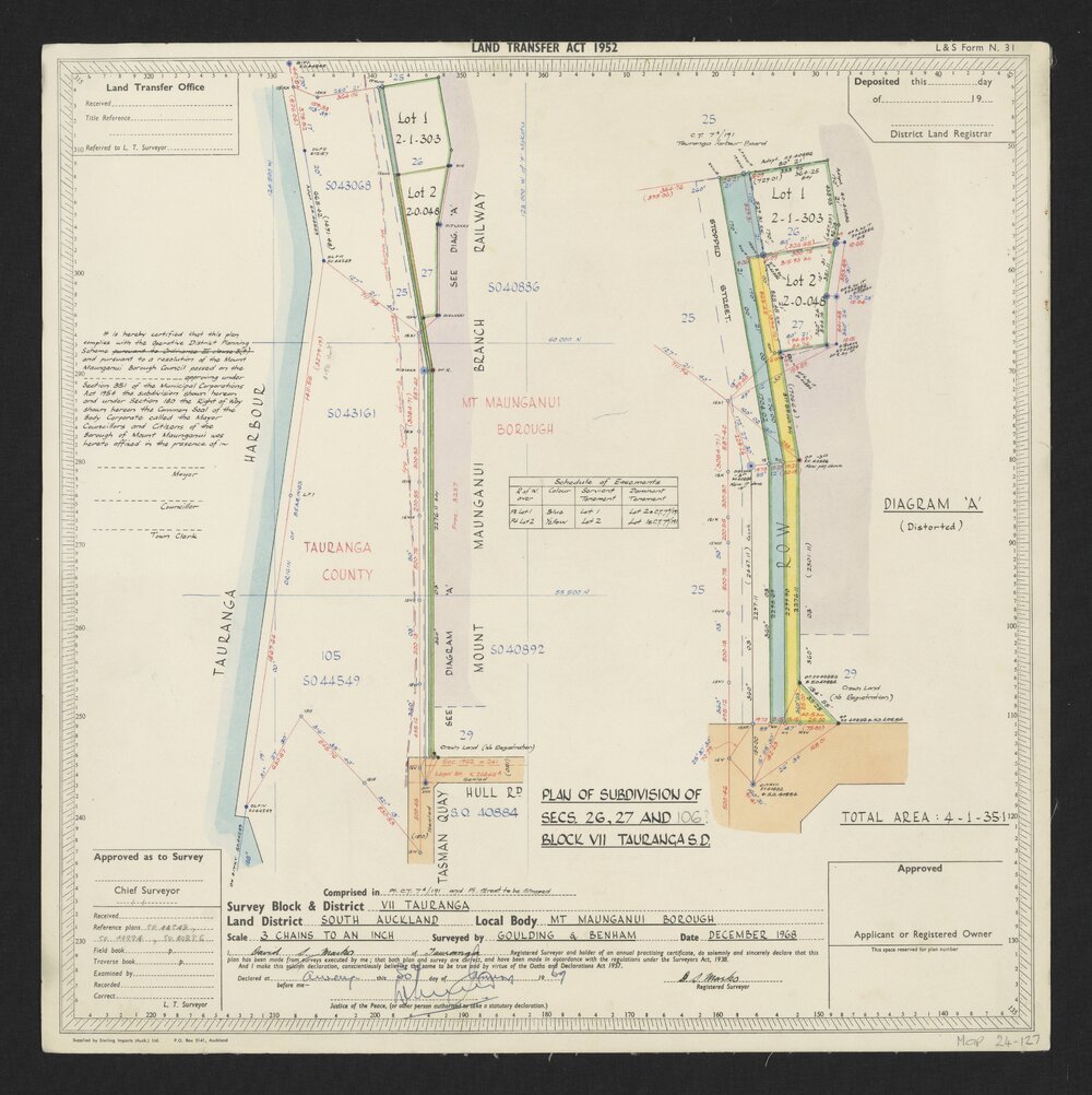 Goulding & Benham, Plan of Subdivision of Secs. 26 & 27 and 106 Block VII Tauranga S.D. (December 1968). Pae Korokī, accessed 09/04/2026, https://paekoroki.tauranga.govt.nz/nodes/view/116033