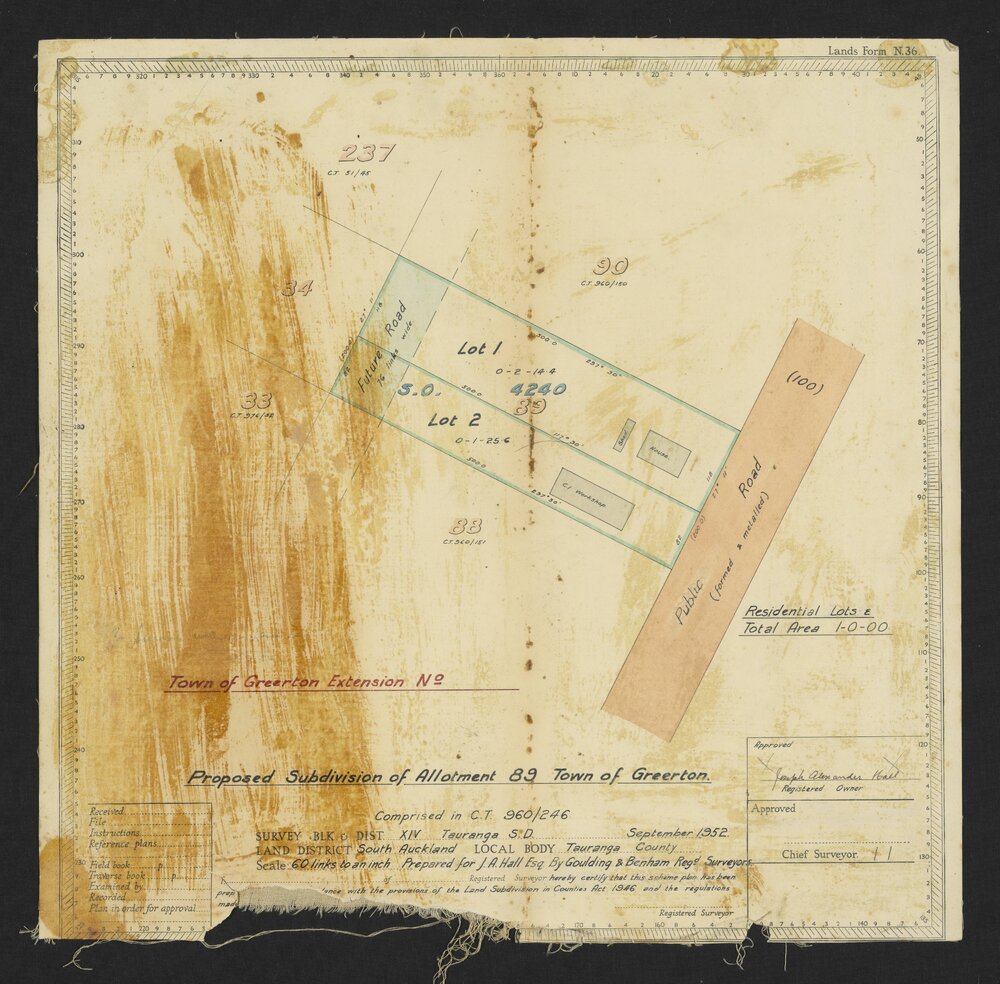 Goulding & Benham, Proposed Subdivision of Allotment 89 Town of Greerton (1946). Pae Korokī, accessed 09/04/2026, https://paekoroki.tauranga.govt.nz/nodes/view/116035