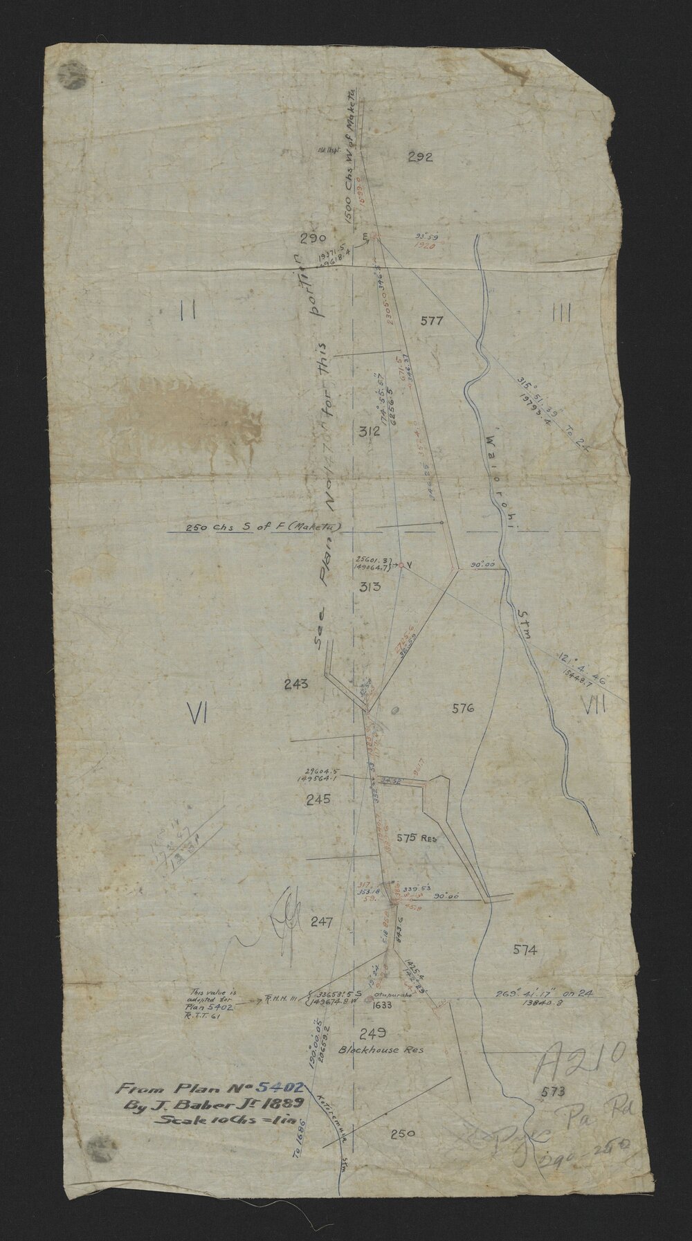 Date1889Reference NumberMap 23-249DescriptionPlan of lots along Pyes Pā road - no. 245, 247, 249 (Blockhouse Reserve), 250, 290, 292, 312, 313, 573,574, 576, 577; also Waiorohi Stream. See "Index Map of Tauranga County" for location.Barcode33001000212208CreatorBaber, JamesMap TypeLand MapsPhysical DescriptionColour map size is 55cm x 28cmScale1:7,920