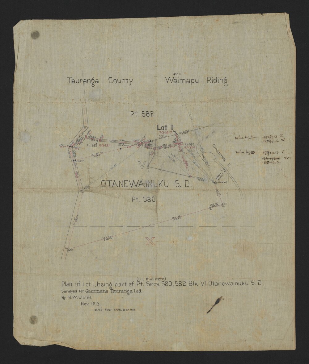 Climie, H. W. (Henry Westcott), 1857-1929, Ōmanawa area: plan of lot 1, being part of Pt. Secs. 580, 582, Blk. VI Ōtānewainuku S.D., surveyed for Gammans Tauranga Ltd (1857 to 1929). Pae Korokī, accessed 25/03/2026, https://paekoroki.tauranga.govt.nz/nodes/view/116070