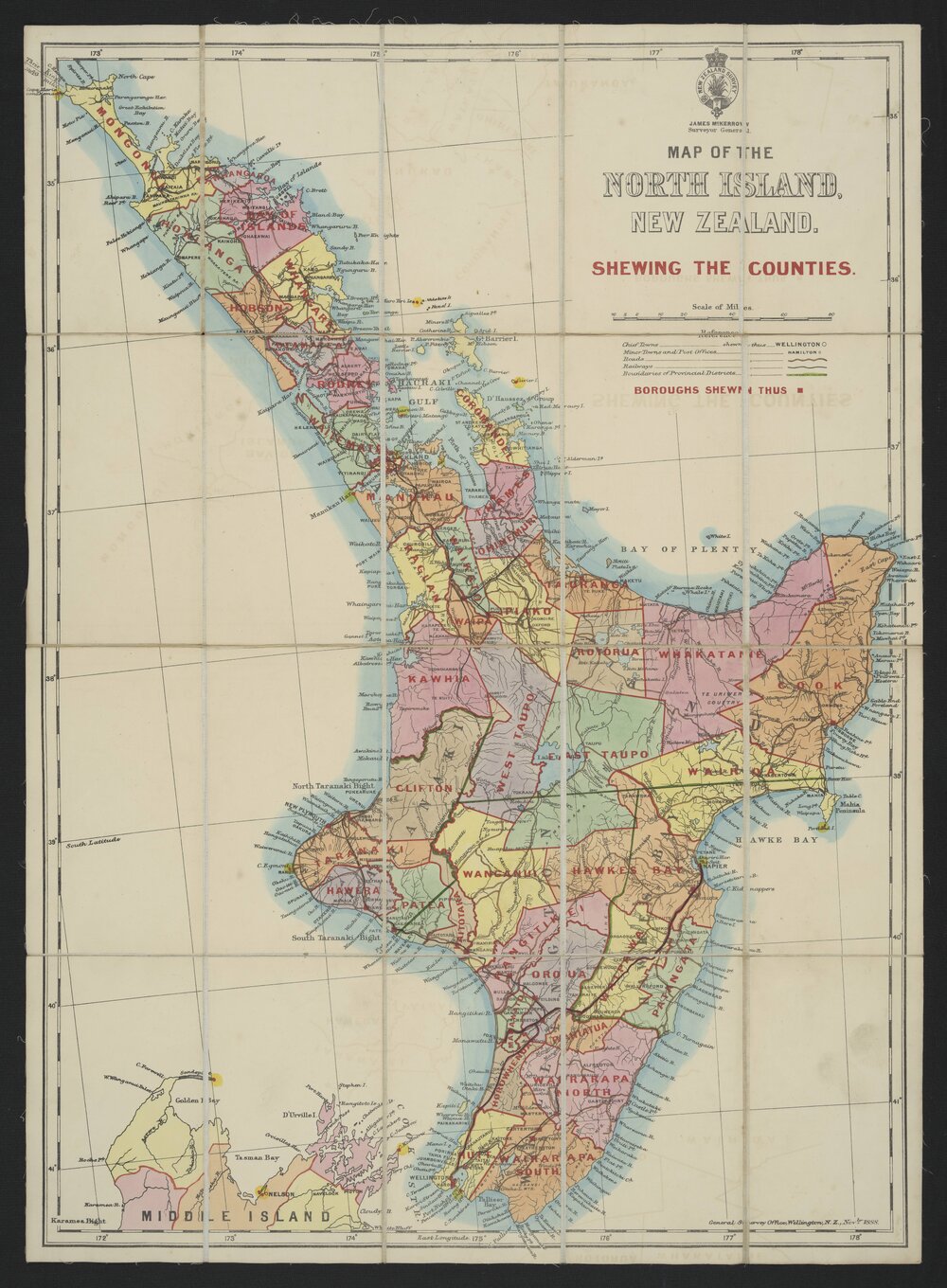 New Zealand General Survey Office, Map of the North Island, New Zealand, shewing the counties (1888). Pae Korokī, accessed 04/04/2026, https://paekoroki.tauranga.govt.nz/nodes/view/116140