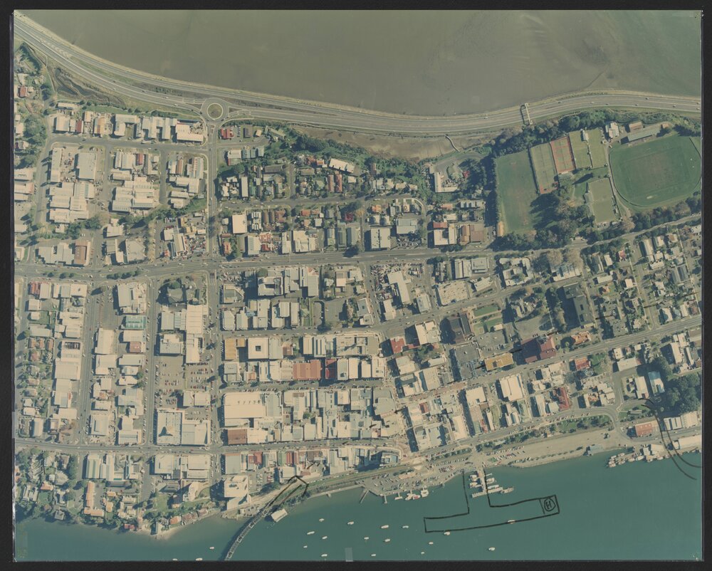 Date1992Reference NumberMap 24-424DescriptionAerial photograph, undated but apparently 1992 (Waikareao Expressway completed, Commercial Travellers' Club still standing), showing Tauranga city centre from Park Road to Third Avenue.Barcode33001000158013CreatorTauranga City CouncilMap TypeBay of Plenty AerialsPhysical DescriptionRolled and laminated - colour map size is 101cm x 204cm