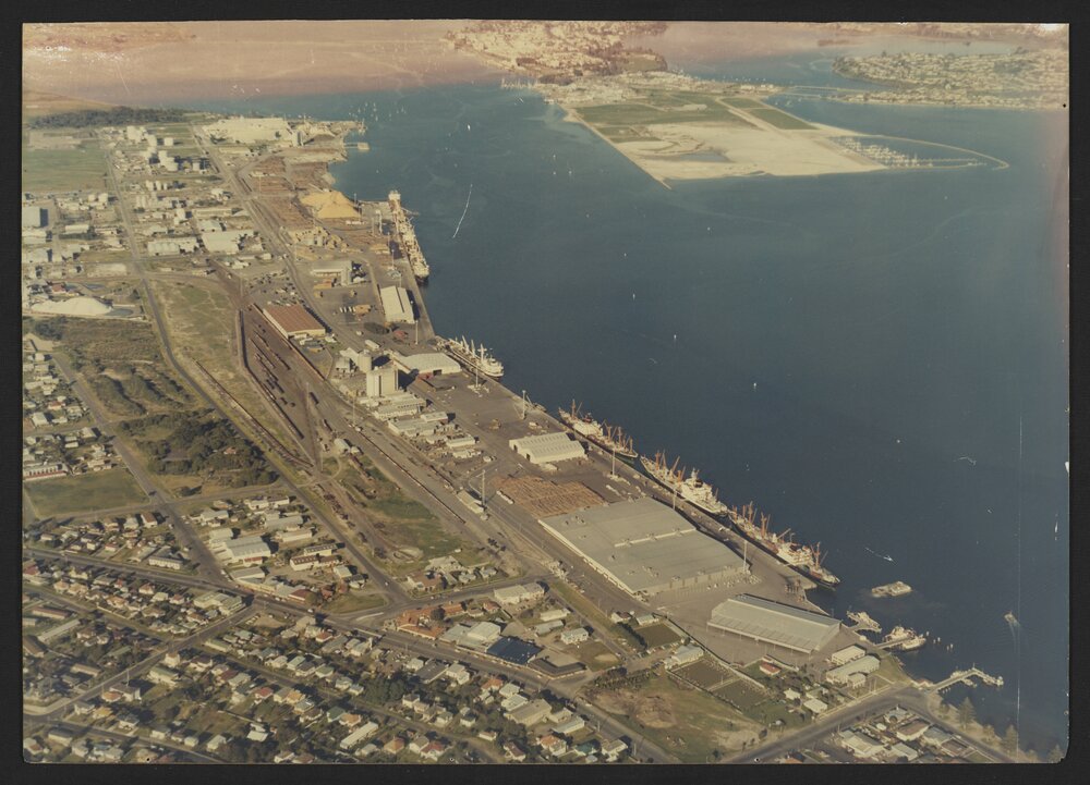 Datec. 1970sReference NumberMap 24-155DescriptionAerial photograph of the Port of Tauranga looking south from above Salisbury Avenue, Mount Maunganui.Map TypeBay of Plenty AerialsPhysical DescriptionHardboard colour map size is 71cm x 101cm