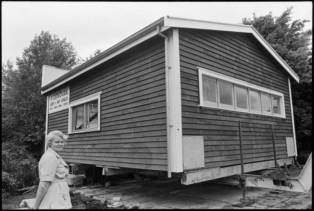 Date28 November 1975Reference Numberphoto gcc-37133DescriptionMrs M. Pascoe of the museum committee looks on as the P. Donovan livery and stables building is about to be moved from Hamilton Street to its new home at the Tauranga historic Village Museum in Tauranga. Published 28 November 1975.FormatNegativePhysical Description35mm black-and-white negative (1/3)Photographer/CreatorBay of Plenty Times