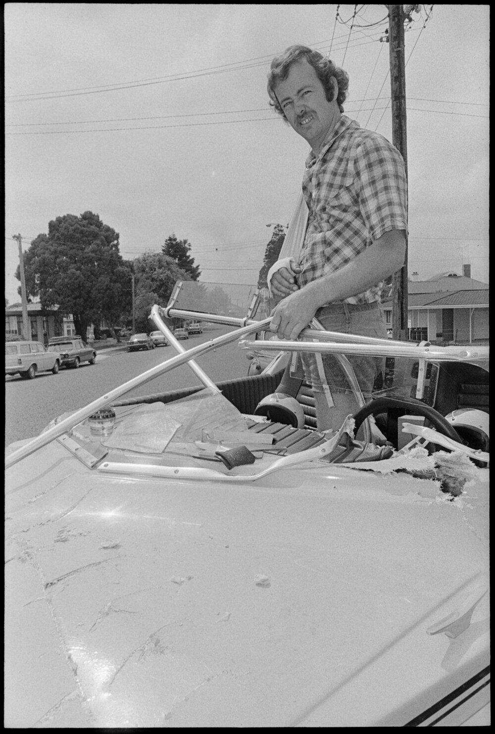 Date2 December 1975Reference Numberphoto gcc-37236DescriptionBob Hunt surveys the damage to his boat after a starting mix-up in the 100-minute power boat race in Tauranga. Published 2 December 1975.FormatNegativePhysical Description35mm black-and-white negative (1/3)Photographer/CreatorBay of Plenty Times