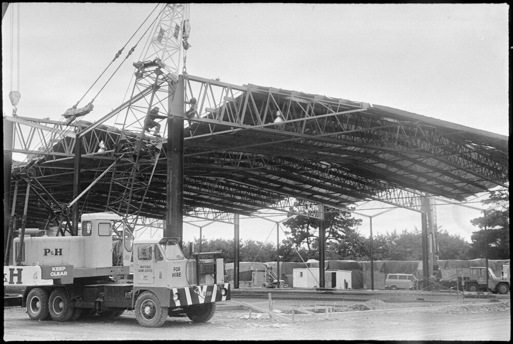 Date4 December 1975Reference Numberphoto gcc-37366DescriptionThe Hawkins Construction Ltd of Mount Maunganui placing a new roof, in sections, on the nearly-completed Mount Storage Ltd's warehouse. Published 4 December 1975.FormatNegativePhysical Description35mm black-and-white negative (3/6)Photographer/CreatorBay of Plenty Times