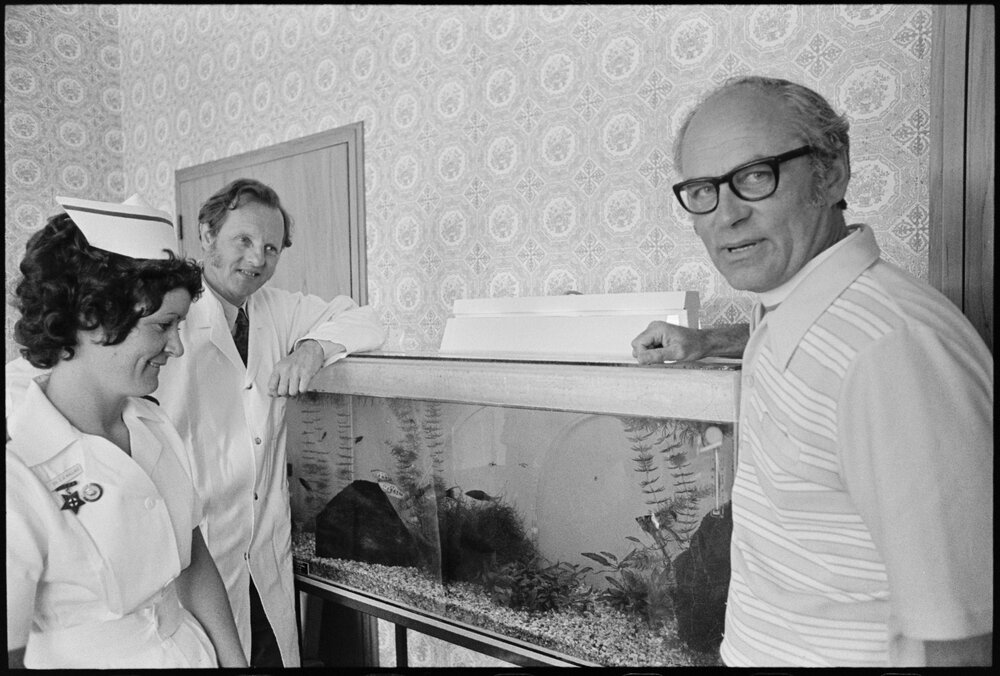 Date6 December 1975Reference Numberphoto gcc-37437DescriptionTropical fish tank, donated to patients in the geriatric rehabilitation and assessment ward at Tauranga Public Hospital. Pictured are Ward Sister C. A. Wallace, Dr A. Reid (left) and Archdeacon D. T. Ferguson. Published 6 December 1975.FormatNegativePhysical Description35mm black-and-white negative (1/6)Photographer/CreatorBay of Plenty Times