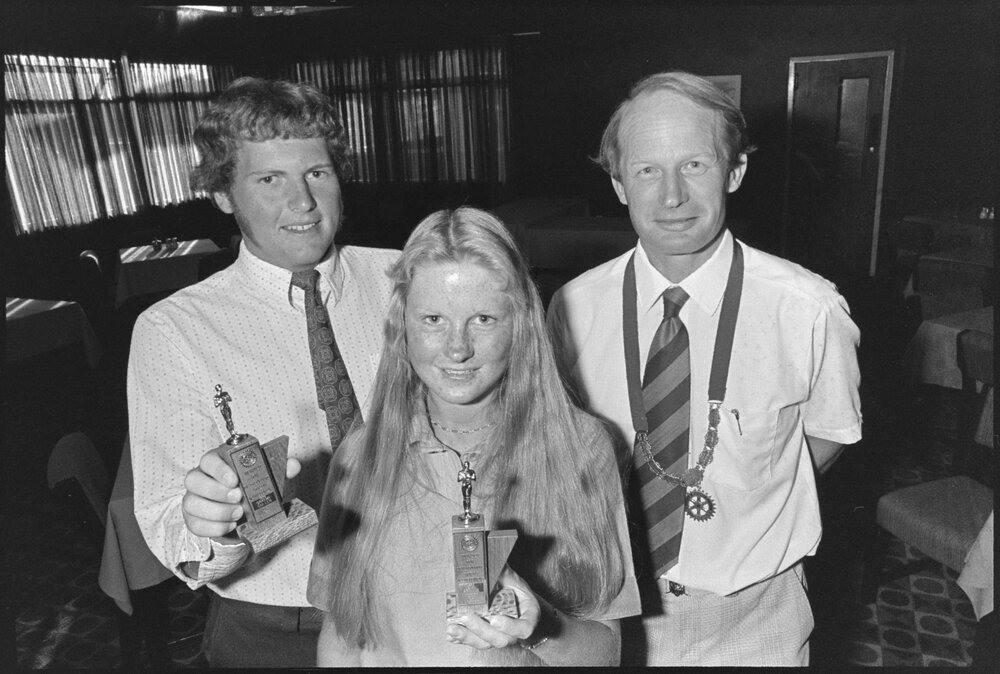 Date10 December 1975Reference Numberphoto gcc-37520DescriptionGraeme Cullen and Jenny Brindle with their Youth Achievement Awards. With them is the president of the Rotary Club of Ōtūmoetai, Dr. R. S. C. Scoular. Published 10 December 1975.FormatNegativePhysical Description35mm black-and-white negative (1/3)Photographer/CreatorBay of Plenty Times