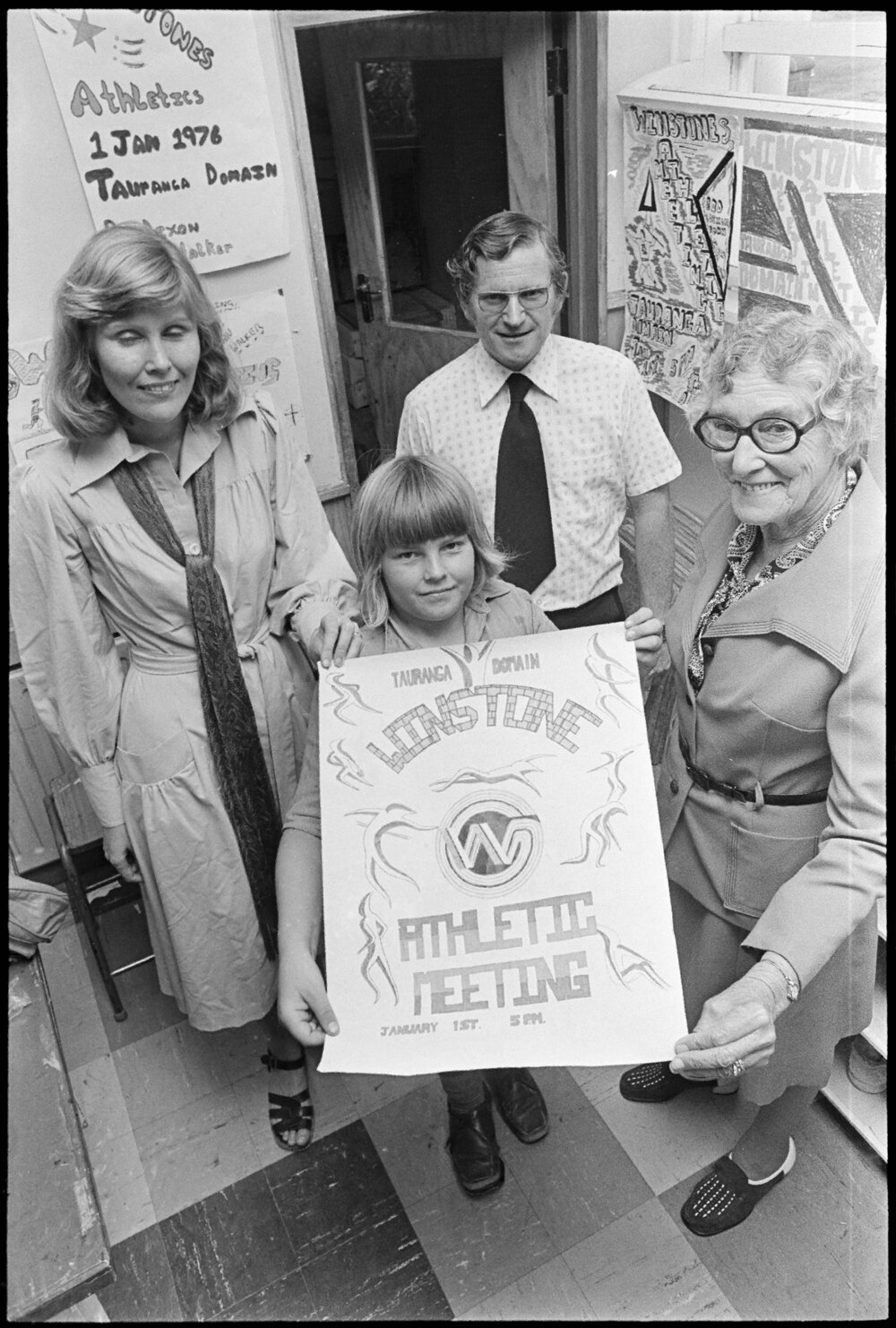 Date27 December 1975Reference Numberphoto gcc-37623DescriptionKevin Wenham (13) with his winning poster promoting a New Year's Day twilight athletics meeting in Tauranga. Pictured also are Tineke Stephenson and Alec McNaull and Mrs Sue Drummond. Published 27 December 1975.FormatNegativePhysical Description35mm black-and-white negative (1/3)Photographer/CreatorBay of Plenty Times