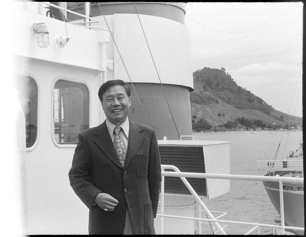 Date16 December 1975Reference Numberphoto gcc-37664DescriptionCaptain Chul, of the bulk carrier, on his first visit to New Zealand. The ship is being loaded with maize for Taiwan. Published 16 December 1975.FormatNegativePhysical Description35mm black-and-white negative (1/3)Photographer/CreatorBay of Plenty Times