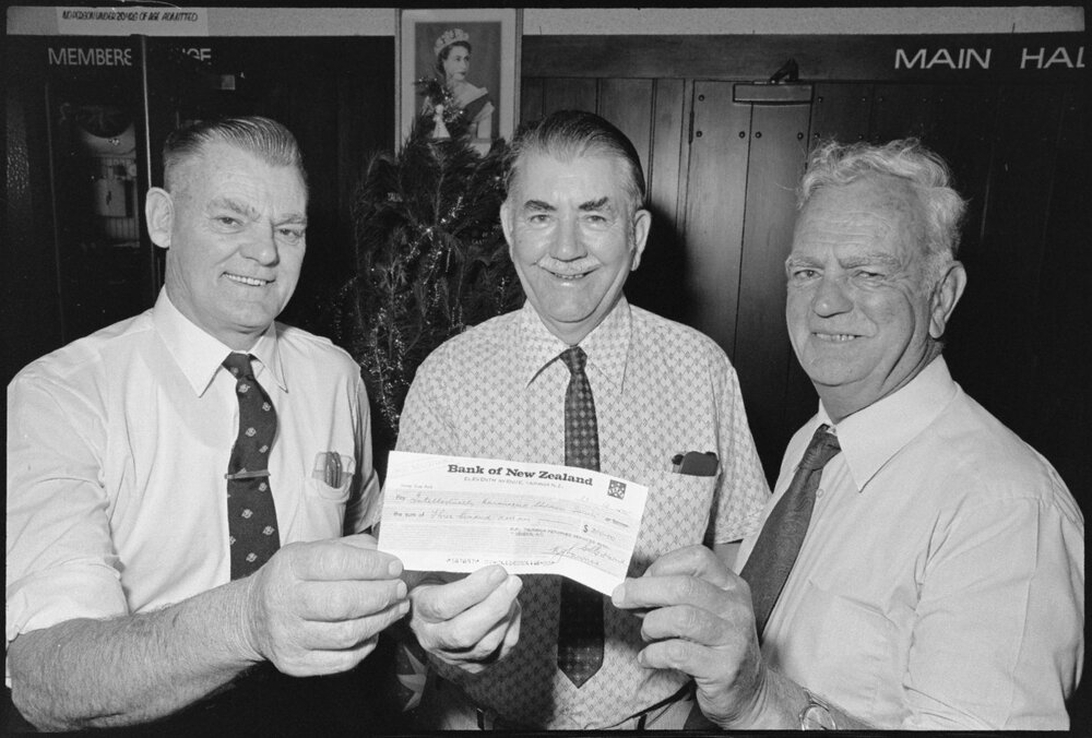 Date19 December 1975Reference Numberphoto gcc-37793DescriptionFrom left, Mr W. E. Jones, of the Tauranga RSA, presenting a cheque to Major E. W. Round, IHC administrator and Mr R. G. Hill, vice-president of Tauranga IHC, for initiative to fund a new mini-bus. Published 19 December 1975.FormatNegativePhysical Description35mm black-and-white negative (1/6)Photographer/CreatorBay of Plenty Times