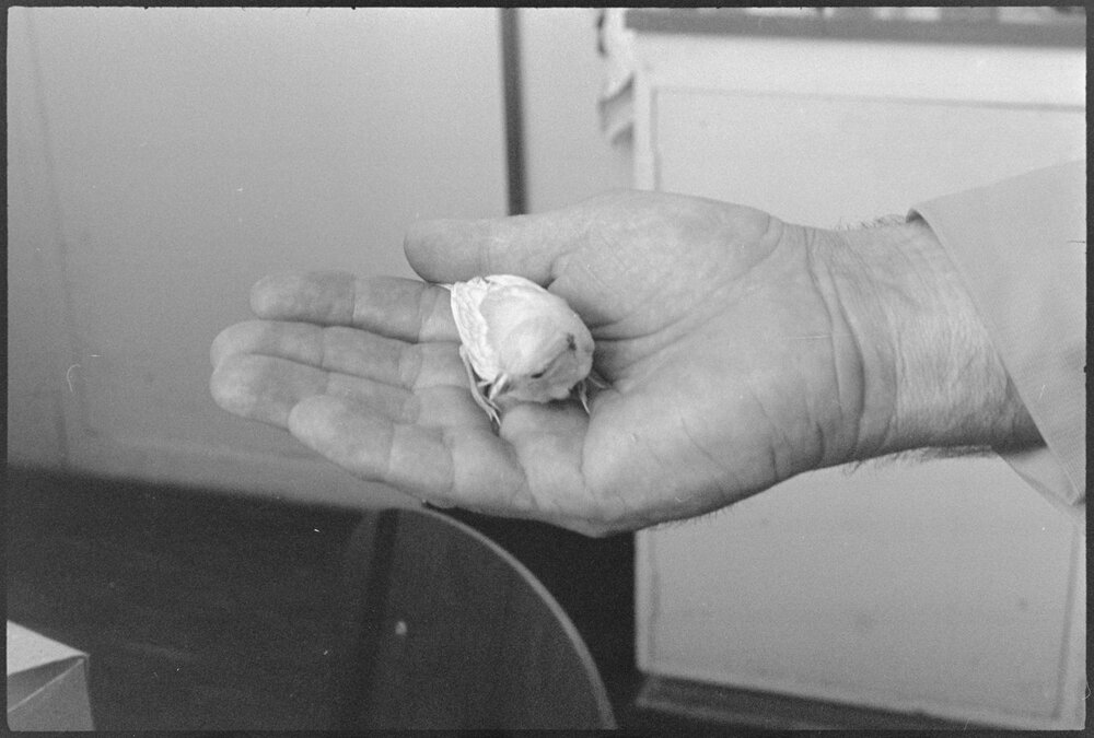 Date8 January 1976Reference Numberphoto gcc-38225DescriptionConstable Don Bowles of the Waihī Police Station with a rescued canary in the palm of his hand. Published 8 January 1976.FormatNegativePhysical Description35mm black-and-white negative (1/4)Photographer/CreatorBay of Plenty Times